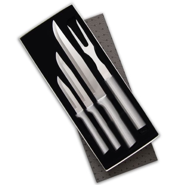 With our Prepare Then Carve Gift Set, the recipient will master the art of meat carving and look like a pro while doing it! This four-piece set comes with three knives-Regular Paring, Utility/Steak, and Slicer-and a Carving Fork. This combination of utensils creates a deluxe set that provides everything needed for carving and serving. We hand sharpen surgical-grade T420 high-carbon stainless steel for a blade with maximum edge retention. Knives are hollow ground to achieve and maintain a sharp edge that lasts. Limited Lifetime Guarantee. Made in the USA.