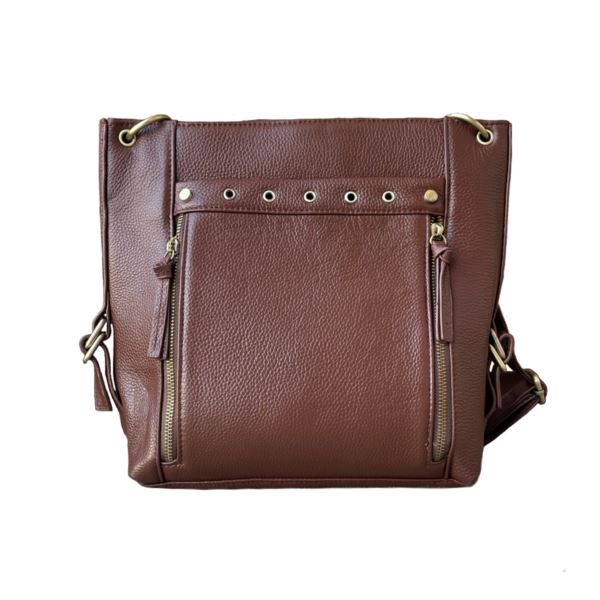 Stylish leather satchel with adjustable shoulder strap is made of genuine cowhide leather. It features a spacious main compartment with interior and exterior storage pockets. Front zipper pockets allow for easy access to grab and go items. Secure pockets on the back (left and right side) include 2 zippers for you your wallet, passport and important essentials. Leather pull tabls and stud features throughout the bag. 10" x 11" x 3.5".