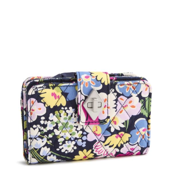 Sophisticated and thoughtfully designed, this Small Turnlock Wallet keeps everything beautifully in place. Featuring two dedicated compartments - one secured with a sleek zip closure and the other finished with a refined turnlock - it offers effortless organization without sacrificing style. Exterior features a slip pocket. Interior features 8 card slip pockets, an ID window and 3 slip pockets. Main compartment has a divider and 2 slip pockets. Turnlock and zip closures. 5.25"w x 3.5"h.