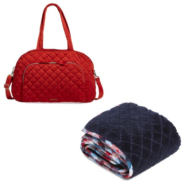 Perfect for overnight trips! This package includes a Weekender with a roomy main compartment made from quilted, sleek, water-repellent polyester. Exterior features one slip and two zip pockets. Interior features five mesh pockets. Trolley sleeve, carry-on compliant, removable strap and zip closures. 18.50" w x 12.50" h x 7.50" d with 6.50" strap drop; 52.50" removable, adjustable strap. Also includes a Solid Throw Blanket crafted from soft, cozy fleece with 2" x 2" quilt detail and recycled cotton trim. Dimensions: 50.0" w x 80.0" h