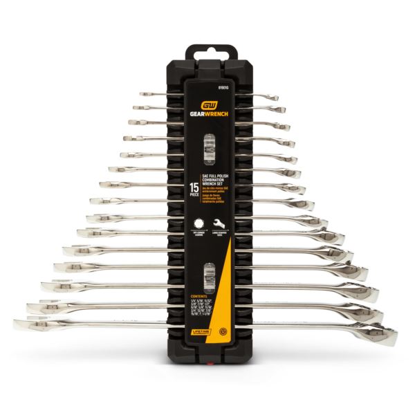These combination wrenches are durable tools for most jobs. They are made from alloy steel with either a full polish or satin finish that resists rust & corrosion. The off-corner loading design on both ends provides a stronger grip on fasteners, reduces fastener rounding, and delivers up to 25% more torque to the fasteners. Long pattern beam length for improved reach, leverage and torque. Sizes are stamped on the beam for quick, easy, & permanent identification. The box end is offset 15° for increased access to fasteners. Includes rack for storage.