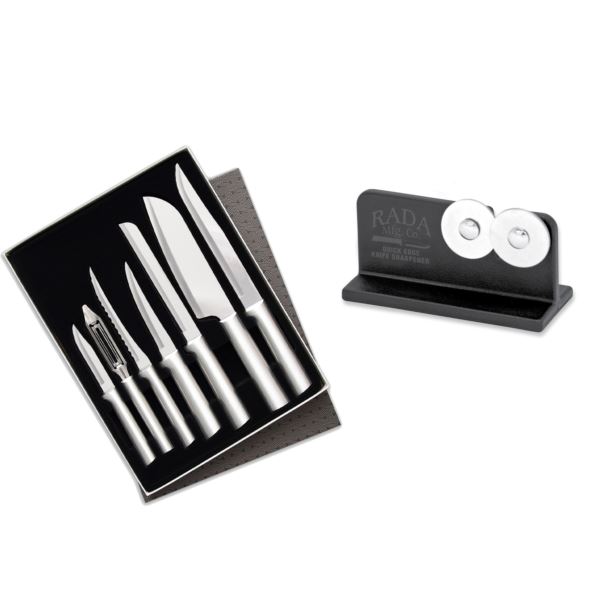 This set pares, peels, and slices through any food in the house. The 7-piece Starter Gift Set includes a Regular Paring Knife, Vegetable Peeler, Tomato Slicer, Super Parer, Bread Knife, Cook's Knife, and Slicer. We hand sharpen super-hard surgical-grade T420 high-carbon stainless steel for a blade with maximum edge retention. Knives are hollow ground to achieve and maintain a sharp edge that lasts. Also includes a knife sharpener. Limited Lifetime Guarantee. Made in the USA.
