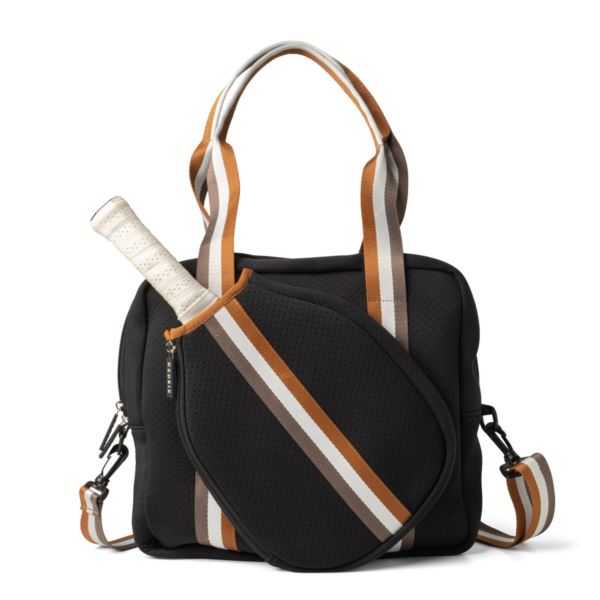Tote your racquet, balls, water bottle, shoes and more in this sporty courtside carry-all designed with soft, ventilated neoprene. Matching crossbody strap included! It has a spacious main compartment and features a zippered racquet sleeve; interior water bottle sleeve; ventilated neoprene, woven straps; and a removable, adjustable strap (55" fully extended).