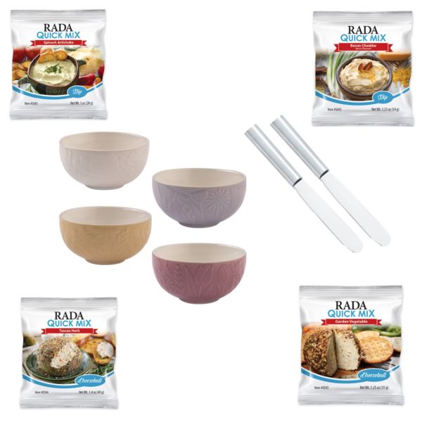 This package includes Mason Cash In The Meadow Mini Bowls – set of 4, that are intricately embossed with delicate florals and foliage, with a beautiful colour palette. The preparation bowls are made from chip resistant stoneware. The bowls store ingredients when preparing food and can be used as pinch pots, dip dishes and dessert dishes. Also included are 2 Super Spreaders, and quick mixes in Garden Vegetable Cheeseball, Tuscan Herb Cheeseball, Spinach Artichoke Dip, & Bacon Cheddar Dip.