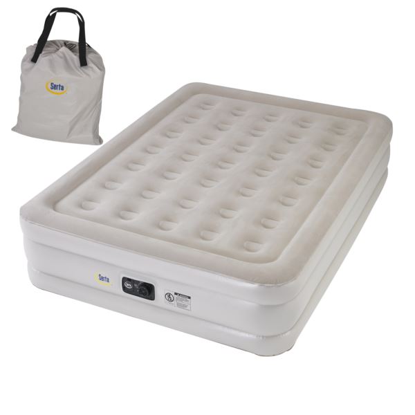 Wake up well rested. Inflation and deflation come easy to this 18" air mattress with internal AC pump. Durable PVC mattress features a built-in pump so the vital accessory is never misplaced. A soft suede top keeps sheets in place. It is conveniently packaged in a lightweight carry bag so you can effortlessly take it on your travels. Features welded coil construction that provides a comfortable sleeping surface. Raised height makes getting in and out of bed easier. Inflated dimensions: 78" x 60" x 18".