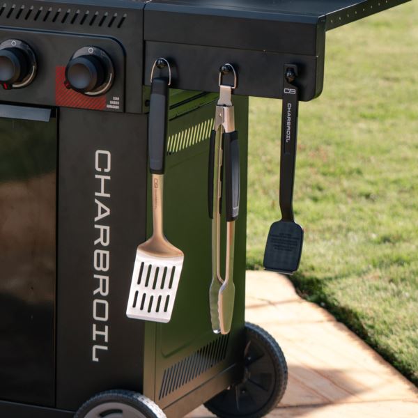 Flip burgers, spear hotdogs, and pick up veggies with ease as this 3-piece tool set helps you handle hot food from a safe distance. The set contains a long handle Spatula, a sturdy pair of tongs and a strong metal fork. Equipped with heat resistant handles and hanging hooks, this is a must-have tool set for every passionate griller.