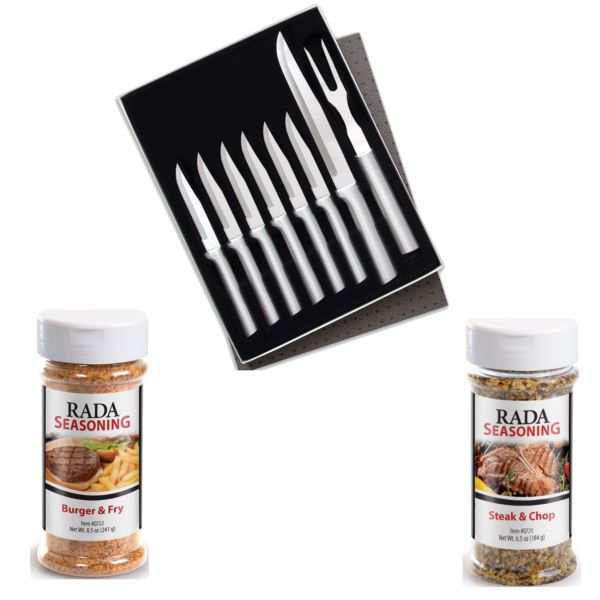 Includes six Serrated Steak Knives, a non-serrated Slicer, and a Carving Fork - everything you need for a delicious feast! We use surgical-grade T420 high-carbon stainless steel for a blade that retains its edge and remains incredibly sharp. Finger guard on knives protects fingers while cutting. Carving Fork has long tines to assure you never lose the grip on your food. Also includes Burger & Fry Seasoning and Steak & Chip Seasoning. Limited Lifetime Guarantee. Made in the USA.