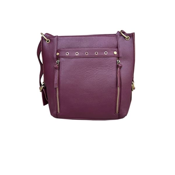 Stylish leather satchel with adjustable shoulder strap is made of genuine cowhide leather. It features a spacious main compartment with interior and exterior storage pockets. Front zipper pockets allow for easy access to grab and go items. Secure pockets on the back (left and right side) include 2 zippers for you your wallet, passport and important essentials. Leather pull tabls and stud features throughout the bag. 10" x 11" x 3.5".