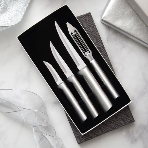 If you know someone who loves to cook but is short on time, this is the set for them. It includes our Granny Paring, Heavy Duty Paring, Super Parer, and Vegetable Peeler. These are the go-to items for tasks that require precision, dependable control, and comfort. The blades hand sharpened surgical-grade T420 high-carbon stainless steel for a blade with maximum edge retention. Knives are hollow ground to achieve and maintain a sharp edge that lasts. Limited Lifetime Guarantee. Made in the USA.