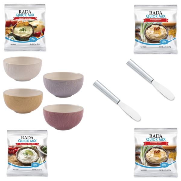 This package includes Mason Cash In The Meadow Mini Bowls – set of 4, that are intricately embossed with delicate florals and foliage, with a beautiful colour palette. The preparation bowls are made from chip resistant stoneware. The bowls store ingredients when preparing food and can be used as pinch pots, dip dishes and dessert dishes. Also included are 2 Spreaders, and quick mixes in Bacon Cheddar Dip (2pc), Spinach Artichoke Dip, and Cucumber & Onion Dip.