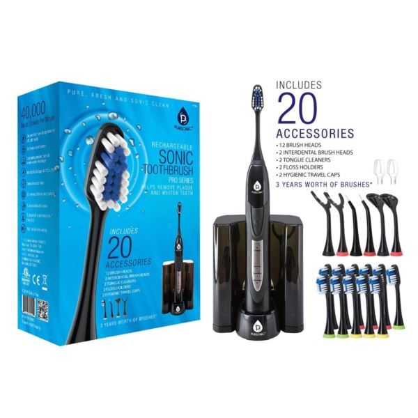 Rechargeable toothbrush designed with sonic wave technology that provides 40,000 sonic strokes per minute to effectively remove plaque without irritating your gums. It comes with a 2 minute timer with a 30 second vibrate alert in order to remind you to brush a different quadrant of your mouth. It has 3 modes - power/clean, soft/gentle and massage. The storage case can hold up to 6 brush heads. Includes charging dock with AC adapter, 12 replacement toothbrush heads, 2 hygenic travel caps, 2 interdental brush heads, 2 tongue cleaners and 2 floss holders.