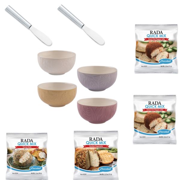 This package includes Mason Cash In The Meadow Mini Bowls – set of 4, that are intricately embossed with delicate florals and foliage, with a beautiful color palette. The preparation bowls are made from chip resistant stoneware. The bowls store ingredients when preparing food and can be used as pinch pots, dip dishes and dessert dishes. Also included are 2 Spreaders, and quick mixes in Sweet Hot Pepper Cheeseball, Garden Vegetable Cheeseball (2 pc) and Tuscan Herb Cheeseball.