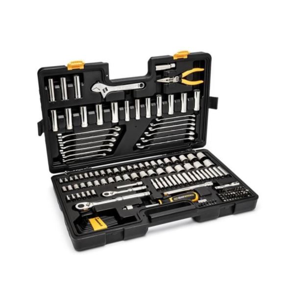 A professional tool set that includes a Pitbull Plier and an adjustable wrench for various applications. It features 2 quick release ratchets, various drive tools, combination wrenches, precision 6 Point SAE and Metric size standard and deep sockets, hex keys, and frequently used bits. 72-tooth teardrop shaped head ratchet with on/off switch allows more access in tight space. Quick release design makes it easy for rapid socket removal. Bright, full polish chrome finish easily wipes clean and resists corrosion. Comes in a blow mold case.