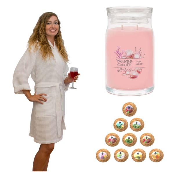 Relax and unwind! Package includes 10 Pc Handmade, Natural and Organic Bath Bombs (Balance, Pink, Clarity, Relax, Euphoria, Restore, Energy, Spa, Heal and Vitamin C). Each bomb is 4.1 oz.; Yankee Candle Signature Large Jar Candle - Pink Sands an exotic island escape in the beautiful mix of bright citrus, sweet florals and spicy vanilla. It is made of premium-soy wax blend and has a cotton wick. Its burn time is 60-90 hours. 6.18" x 3.7" and weighs 20 oz.; and a 36" Knee Length Robe is made with soft waffle-textured cotton . One size fits most.