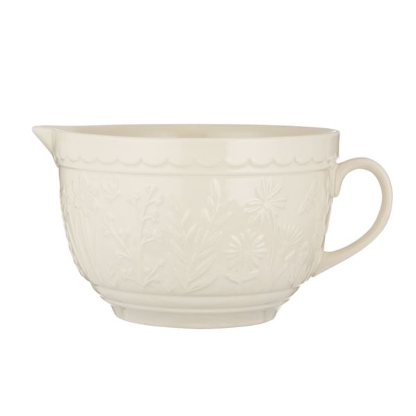 In the Meadow collection is intricately embossed with delicate florals and foliage, with a beautiful colour palette. Made from Chip resistant Stoneware, making it an essential item for the everyday baker. The distinct patterned exterior is designed to help bakers grip the batter bowl, while the strong handle allows the bowl to remain sturdy and in place when mixing. It also features a pouring lip which is ideal for pouring. The bowl measures 5"H x 7.5"W x 10"D, with a capacity of 1.9 litres. The batter bowl is dishwasher, microwave and freezer safe.