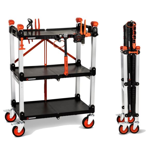 Designed to keep all your tools and materials within arm's reach. No assembly required. Holds up to 100 pounds per shelf. T-channel accessory rail to attach a variety of accessories and tools. Palm grip handles optimize control and maneuverability on the jobsite while doubling as a hanging notch. Durable, non-marring 5" casters with 2 swivel and 2 fixed casters with brakes. 8" compact folded profile for easy transport and storage. Lift handle enable you to easily lift the cart over objects. Transports easily using the carry handle. Patent pending.