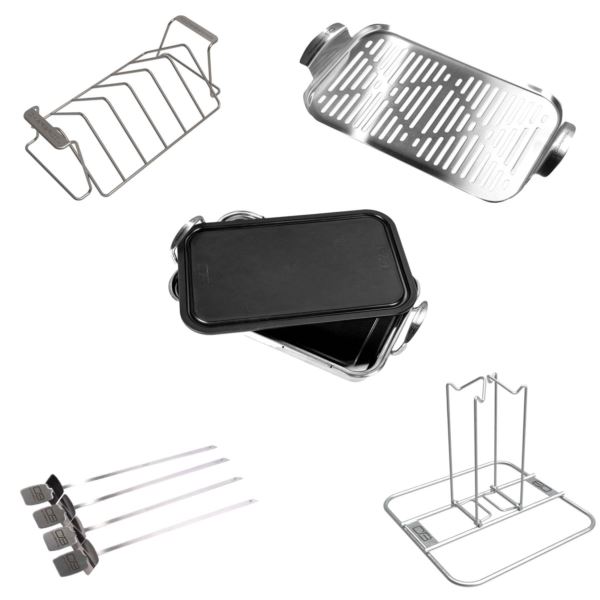 Create delicious food without the mess with the Grill + Accessory System. Compatible with any grill or oven, these stainless steel Grill + accessories can be used independently or together with the Deep Dish for endless meal possibilities. Includes: Deep Dish & Cutting Board; Topper; Pan; Rib & Roaster Rack; Double Pepper Roaster; Folding Beer Can Chicken Roaster and Sliding Skewers (set of 4).