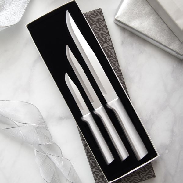 Every cook would be thrilled to receive this three-piece set that includes a regular paring, utility/steak and slicer in blade sizes 3-3/4", 4-7/8" and 7". The blades are hand sharpened surgical-grade T420 high-carbon stainless steel for a blade with maximum edge retention. Knives are hollow ground to achieve and maintain a sharp edge that lasts.Handles are made from permanently cast brushed aluminum with a satin finish. Limited Lifetime Guarantee. Made in the USA.