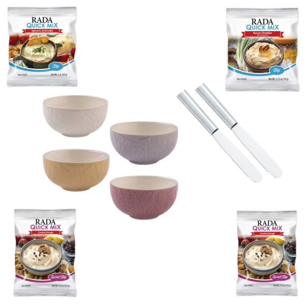 This package includes Mason Cash In The Meadow Mini Bowls – set of 4, that are intricately embossed with delicate florals and foliage, with a beautiful colour palette. The preparation bowls are made from chip resistant stoneware. The bowls store ingredients when preparing food and can be used as pinch pots, dip dishes and dessert dishes. Also included are 2 Super Spreaders, and quick mixes in Cookie Dough Dip (2pc), Spinach Artichoke Dip, and Bacon Cheddar Dip.