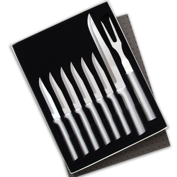 Includes six Serrated Steak Knives, a non-serrated Slicer, and a Carving Fork - everything you need for a delicious feast! We use surgical-grade T420 high-carbon stainless steel for a blade that retains its edge and remains incredibly sharp. Finger guard on knives protects fingers while cutting. Carving Fork has long tines to assure you never lose the grip on your food. Limited Lifetime Guarantee. Made in the USA.